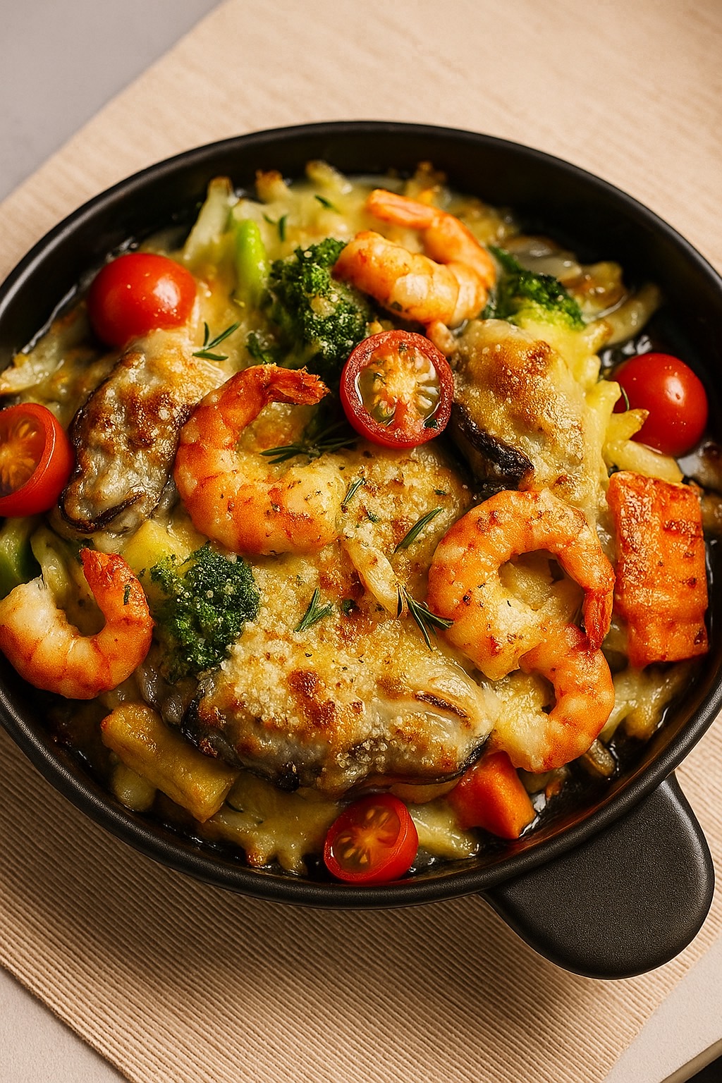 旨みたっぷりの牡蠣と海老、ホクホクの秋野菜を香ばしくチーズで包み込んだ逸品。