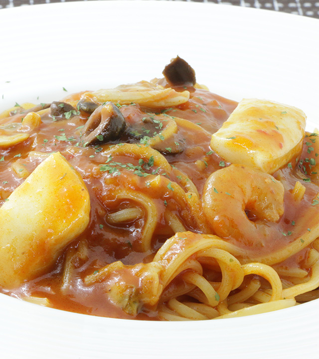 魚介たっぷりトマトパスタ。ピリ辛アクセントがビールにピッタリ。